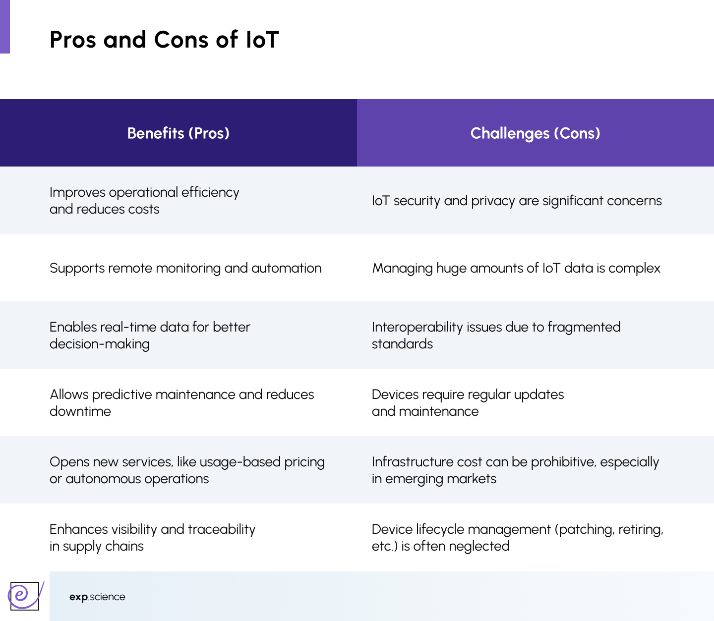 IoT brings strong advantages across industries, from reducing downtime to unlocking new services and improving visibility. Real-time data collection enables predictive maintenance, while automation cuts manual effort and boosts precision. However, challenges remain: devices must be secured, standards need alignment, and data overload can strain infrastructure. Overcoming these hurdles is essential to scale IoT in a secure, sustainable and efficient way.