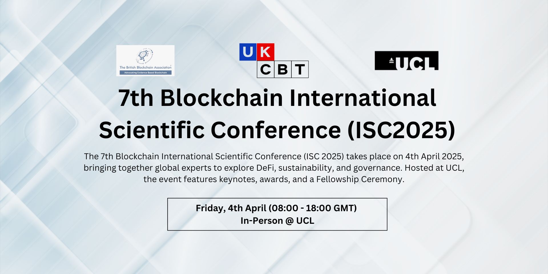 On 4th April 2025, University College London hosts the 7th Blockchain International Scientific Conference (ISC 2025), co-organised by the UK Centre for Blockchain Technologies (UK CBT) and the British Blockchain Association. The conference brings together academics, policymakers, and industry leaders to engage in discussions on the future of blockchain and distributed ledger technologies.